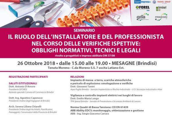Continua a leggereGIORNATA DEL SEMINARIO VENERDI' 26 OTTOBRE 2018 DALLE ORE 15:00 ALLE ORE 19:00 Luogo seminario: Tenuta Moreno - c.da Moreno S.S. 7, uscita Latiano Est Ai Geometri partecipanti saranno riconosciuti 2 CFP previa iscrizione nel SINF Codice...