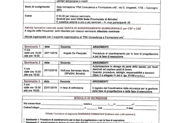 Continua a leggereProcedure di coordinamento per la fase di progettazione e per la fase di esecuzione GIORNATA DEL SEMINARIO MARTEDI' 20 NOVEMBRE 2018 DALLE ORE 15:00 ALLE ORE 19:00 Luogo seminario: Sala formazione "PMI Consulenza e formazione" -...