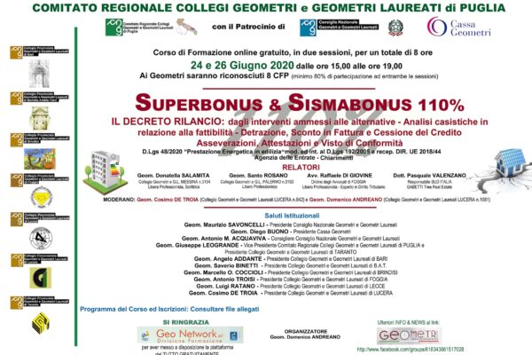 Continua a leggereIl Comitato Regionale dei Geometri e G. L. di Puglia, con il patrocinio della Cassa Geometri e del Consiglio Nazionale Geometri e G.L, ha organizzato il Corso di formazione gratuito online: "SUPERBONUS 110% procedure tecniche,...